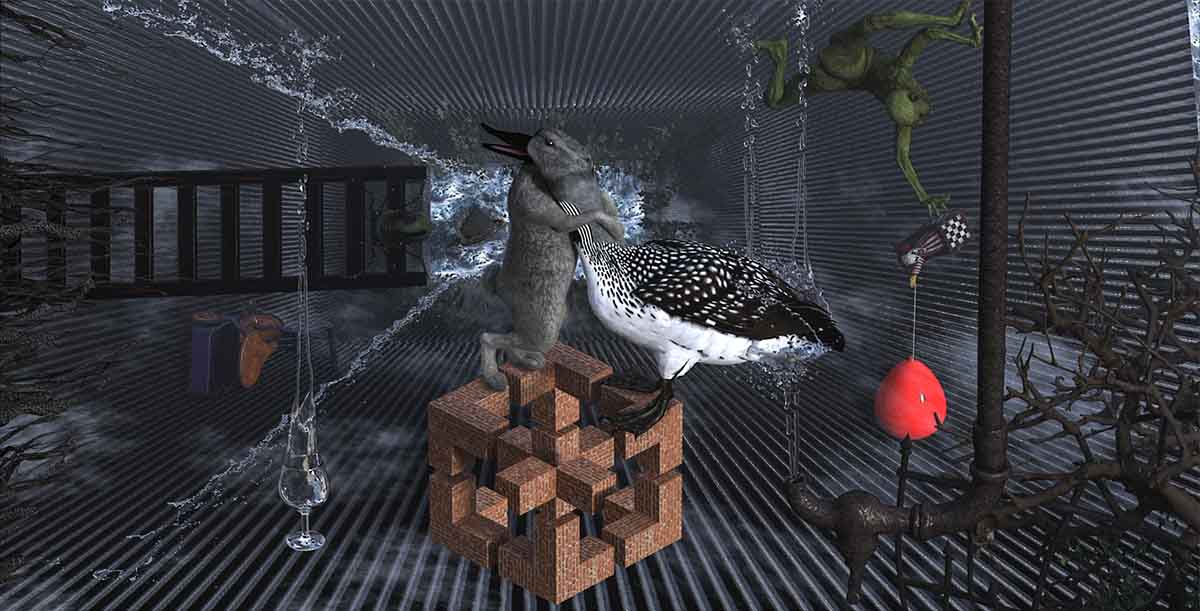 The duck rabbit illusion with the ambiguous head is one of the great classics. It is very old, certainly back into the 1800's. Like many illusions it depends absolutely on a unique view point, usually a very precise one. It's a strictly 2D illusion. If you were to rotate the 3D figures or move the camera it would almost instantly fall apart, to the point where it would soon not only cease to be an illusion but would, in all probability, become completely nonsensical. I think it would be far simpler to create in 2D, especially if you were taking the photos yourself. So I am curious why you chose to do it with 3D modelling, although I suppose if you set up your camera at the beginning you can model right from the start to it's unique point of view even if it looks like nonsense from other viewpoints. My guess is you chose to it in 3D quite simply because 3D is the medium with which you are most familiar and adept. And, for you, it's absolutely the right choice. It's impeccably done Dennis! Even though the duck head and neck are just a bit too seamlessly joined for the rabbit head to really work completely, the illusion is damn near faultless. Terrific. I am seriously impressed. _________________ The subtlety and conviction of any Photoshop effect is invariably inversely proportional to the number of knobs on it ....... |