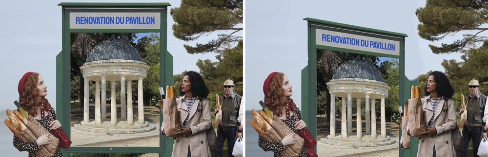 It didn’t occur to me when posting this Challenge that the hardest part would be those square capitals on the columns added to the back. It would have been so much easier if they were round! First to visit the pavilion this week was lwc, moving it to a new location (attractive park, by the way) and with added symmetry. The square capitals are a real problem, aren’t they. But I the darkening of the columns works well. I like the distance view, but couldn’t spot the third person until you pointed her out. The distance certainly helps obscure those square capitals! Splendid trees in the infrared version, which is bound to appeal to GKB. You’d think the couple would find somewhere more private for their shenanigans. Is that one of Gordon’s rubber ducks gone bad? It’s a really scary monster! But it does seem to be well caged by those columns. A perfectly realised background infill from GKB, with suitably shaded columns. Those square capitals! I like the statue, although he seems rather odd being placed flat on the ground without a plinth. I’ve noticed that you something of an obsession with rubber ducks. Well, they are very cute – as is the candy-stripe carousel. Ah… that Magic Roundabout theme tune will be going round my head for the rest of the day! Absolutely charming. I really enjoyed this one. I like the Rhossili Bay, with its added attraction. Purists might wonder what’s casting those shadows on the roof of the pavilion. Brilliant work from Ant Snell, who has managed to give the impression the roof is being suspended even though it hasn’t moved from its original position. There’s so much great detail here: the way the ropes wrap around the roof, the man holding the column, and especially the plan diagram of the pavilion – did you draw that from scratch? Outstanding, Ant. All it needs is some kind of fixing where the ropes meet the underside of the roof, and perhaps a couple of shadows of the rope. I see the square capital issue has plagued even Mariner, although it is barely noticeable in the shadows. A well-judged background, and the courting couple make a good focus. Tremendous opening-out of the scene in the wider entry, restoring the view over the sea (although the Ile de Ré would be surprised to find it had grown mountains). Beautifully done, with the benches neatly framing the scene. As always, I’m impressed by your workmanship: especially removing the shadows from the columns and roof of the pavilion. Expertly done. Baguettes, stripy tee shirts and berets from DavidMac, a sure sign we’re in France. I love the Escher-like treatment of the pavilion, an innovative idea that works really well. A couple of issues: the trunk of the tree to the left of the original pavilion seems to have a kink in it. But more importantly, having the sign square on to the camera not only makes it look artificial, it also has the effect of breaking the image up so it looks like three different shots, rather than a coherent whole. It only takes a simple perspective distortion to fix the problem: