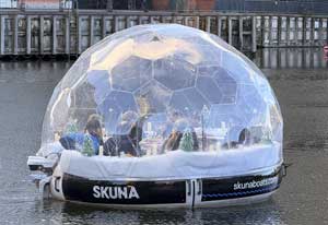 After a recent visit to London's Museum of the Docklands I passed this curious floating restaurant. The "tables" are pods containing around six to eight people, and they're taken for a trip around the docks before their meal is served. The trouble is, all they're seeing is modern office buildings with the occasional Victorian warehouse. Can you suggest a better sightseeing tour? High res is here. |
