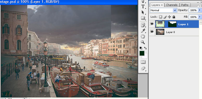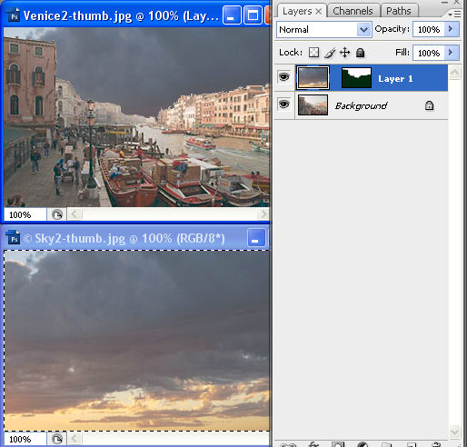 Okay, here they are the same size. I paste it into and as you can see it does not work correctly. It is pasting it into the selection as a new layer (so to speak) it is like a layer behind the buildings, so the bottom half (yellow part of sky) is behind the buildings. ![]() |