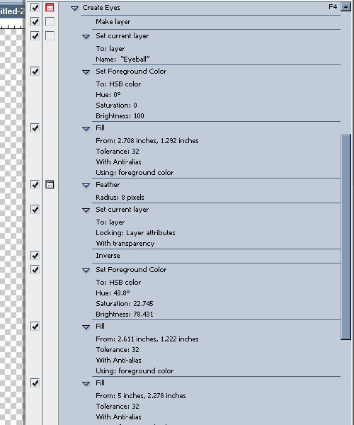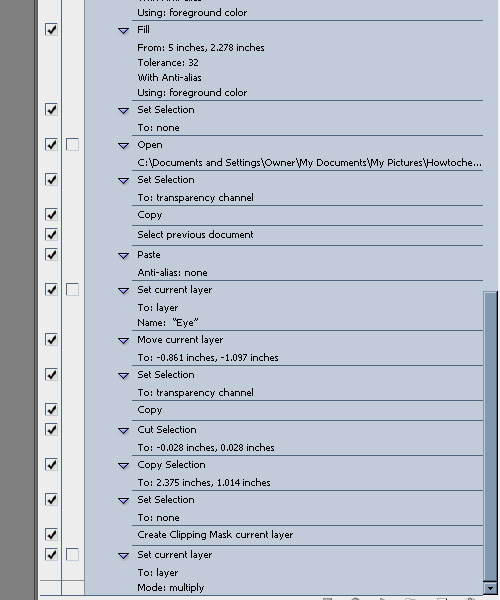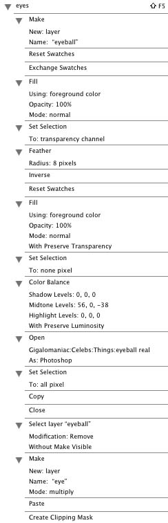 OK, this looks to me as if you're trying to specify absolute locations for the Action. Which, as you point out, will work for the current image, but not for those with different positions for the eyes. When I wrote this Action, I started with a pen-drawn selection of the eye area itself. It means I then have to move and scale the iris manually, but I think it's the only solution. This is the action in full: ![]() |