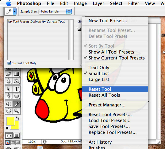 David, At the moment the only thing I can suggest is resetting the colour picker. Select the picker and go to the small tool box at top left of the screen. Click on the arrow. In the box that now appears click again on the horizontal arrow which brings up another box. Click on 'Current tool only' and then 'reset tool'. If this doesn't work then I'm sure that someone will very shortly come up with the glaringly obvious solution. Gordon ![]() _________________ Time flies like an arrow; fruit flies like a banana. |