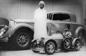 Last week saw a Ferrari Testa Rossa sell at auction for a record-breaking $243,864. It doesn't sound that much for a Ferrari, but this was a scaled-down child's car. It turns out people have been making scale replicas of sports cars for exactly 100 years, since Ettori Bugatti made a half-size replica for his four year old son in 1926. Here's Mohammed V, king of Morocco, with his son Hassan visiting the Bugatti factory. Neither seem particularly to be enjoying the experience. There must be a way to cheer them up. High res is here. |