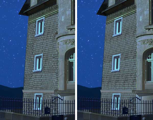 I don’t know what’s going on with your file uploads – and I’ve never seen a + sign on any images on this site, that could be a browser thing. Those are very cuddly bats! And even the ghost is quite friendly. The spider's web entry is gun, although I’m more interested in what’s going on in that top window. Plenty going on in Frank's entry, with ghosts and other evildoers wandering the desolate landscape. I like the inclusion of last week’s pavilion. Whoever owns that house really does like red lights. Can you explain the ladder into the skies? And what’s holding up the Welcome Sinners sign? Some magnificent action in the second entry, with the headless horseman placed just far back enough to blend him into the scene. Love the desolate landscape, and the new staircase up to the house. The reflections are nicely judged, too. A really powerful image. I thought Mariner might do some research, and it is indeed the Villa Alsace. The lighting is excellent, and the repaired window is most impressive. I like the eyes at the top. I assumed you would attempt to rebuild the wall behind the hedge, but making the texture work isn’t quite as tricky as it might appear. I copied a section of it to a new document, squared it up to remove the perspective, and blended it to make it seamless. Then I duplicated it to the right size and distorted it to fit the wall: