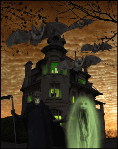 A retro feel from tooquilos, with spooky ghosts apparently rising out of the graves. I was wondering about the bright white of the windows, though; should we assume that the picture frame was originally white? In which case, shouldn’t that set the bar for the maximum brightness? No such concerns in the animated version, with a sky full of… illuminated flying pumpkins? Sky candles? Those things have got me baffled, pretty though they are. I see Ant Snell has gone for the comedy angle, with some truly absurd decorations. I like the face in the tree best. The bats are among the friendliest I’ve seen, that’s a remarkably cheerful pumpkin, and the child looks suitably baffled by the whole thing. Only the figure in the top window displays any real menace. Detailed spookiness from DavidMac, with magnificently human-headed bats flying over a rugged landscape. I like the wafer-thin bridge, the hearse, and of course the overall lighting. It’s worth zooming in to see the profusion of detail in the windows, although I do have to point out that the four poster bed in the upstairs window is viewed from above, when of course we’re seeing the room from below (it’s your own fault for putting in so much detail). Zooming in also reveals a curious horizontal line in the sky below the moon. But ignore these comments, it’s a really fine image. And very interesting to see your source material. Some great drama in the rainy entry, with the woman in the window (very nicely backlit, by the way) peering out at the mysterious cloaked figure. I like the reflections. There’s something about the rain that doesn’t quite convince, though; is it simply too opaque? The Nosferatu image is something of a tour-de-force, as you expected it would be – the way the shadow bends over the contours of the building is astonishingly convincing, and I can’t believe the amount of time and effort you must have had to put into this. Splendid. An initial triptych from lwc, with green and orange skies and an assortment of ghouls. Why is it that the children are the scariest of all? I enjoyed the placement in your local lake, where it looks right at home. Yes, the perspective isn’t quite right, but it’s a two-minute fix: