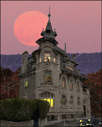 First to light up the house this week was Ben Boardman, cleverly dealing with the extreme perspective by moving it to the top of a hill. I like the witches, the pumpkins, the bat and the lit-up windows, as well as the rather splendid cliff face. But I’m confused by the surface on which the witch is standing: it doesn’t appear to be steps, so why is it sloping down like that? The vintage camera entry is absolutely glorious, a near-perfect image: the lighting, the couple, the car, the upside-down view in the camera, even the squirrel peeking in at the bottom… gorgeous, Ben. If I were a nitpicker (well, you know I am) I might point out two tiny errors – the perspective of the car is rather extreme for this distance, and there’s a ghostly outline of the spire just next to it – but those are barely worth mentioning. A terrific piece of work. A fiery image from GKB, replacing bats with dragons – now that’s a Halloween innovation. I’m going to pick a nit that’s so small I’m almost embarrassed to mention it. The reflection of the pumpkin in the road surface shouldn’t show over the vertical face of the kerb: