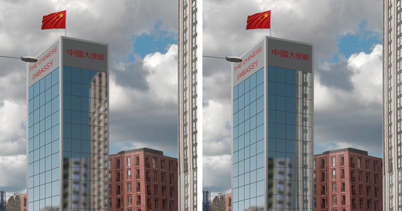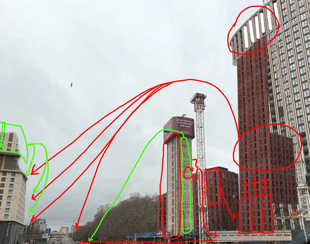 First to move into the apartment building this week was Ben Boardman, with an astonishingly realistic entry. Beautifully composed and lit, and I’m still trying to work out where you found so many people photographed below, from a distance. A glorious piece of work. Just one very small error: you’ve made the bottom of the billboard poster almost parallel with the bottom of the image, but remember we’re still looking up at this. I think you realised this in the more distant version. (Great sky, by the way.) The building seems to have vanished entirely in GKB's neatly patched entry. What can have happened to it? Ah – all becomes clear in the animated version. I like how the crane provides the sense of depth, and the architectural tremors are very effective. A very dramatic Tehran entry, with a particularly fine gilded cage at the top. Wouldn’t all that flame give the buildings a reddish tint? A touch of politics from Ant Snell, with the newly-renamed tower moving to what we presume is Epstein Island. Very imaginative and well-executed. There’s something a little odd about Trump and Mandelson in the foreground, but then there is something a little odd about both Trump and Mandelson. Acerbic comment from DavidMac, referencing the legend on the Statue of Liberty. Very nicely done. I’d have darkened the top of the rear section of barbed wire as it appears in front the tower, just to avoid that light fringing. I was going to say I hope your negative frame of mind improves, but later events of this week make it unlikely. A novel architectural approach from tooquilos, although the prospective residents might complain about the lack of windows. I like how you’ve replicated the building further down the street. Great to see them spinning in the animated version; maybe they should be corkscrewing up out of the ground? A glorious steampunk fantasy from dwindt, with the streetlight repurposed as a flying saucer. Beautifully composed, with all the elements blending together perfectly. Beautiful work. I’m intrigued by your source photograph – where did it come from? Collapsing architecture from lwc, as the crane appears to be bulling the whole building down. I like the detail of all the loose rubble falling out of the break. That’s a great group of people, but they’re obviously photographed in bright sunlight… tricky to change, I realise. The rebuilt apartment block is a good replacement, even if the perspective is a little extreme for its height. I see Mariner has proposed a new location for the controversial Chinese Embassy. It does fit in well on this street, and I like the fact of the reflections of the surrounding buildings. Just a couple of points: why are the reflections all blurred? I don’t think glass would do that. And the reflection of the building on the right of the frame is the wrong way round. From this angle the side of the embassy would be reflecting the side of that building, not the front: