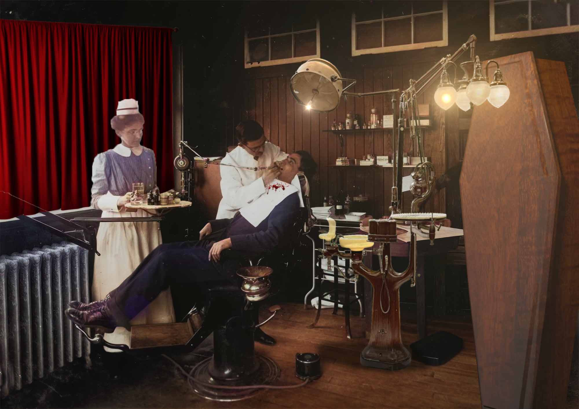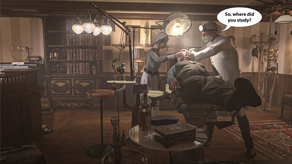 First to take to the chair this week was Ant Snell, the dentist’s equipment making a guest appearance in a Frankenstein movie as a lightning source. It certainly fits the gothic theme. I particularly like Dr F’s cheeky expression, although I’m curious as to why he has no legs. I see on your recent trip to London you visited the Wellcome Collection – as you say, the ultimate cheat is doing it in person! Ingenious. Beautiful work from lwc, the chair blending immaculately into the surgery. You’ve matched the colour, grain and softness of the background photo to perfection. The chair fits neatly into Ben Boardman’s entertaining assortment of steampunkery – Bee Gee Way? As in, you know, the Bee Gees? Looks like a fun place for lunch. I’d like some of those at home. An extraordinary history lesson from DavidMac, with Painless Parker (and I admit I’d never heard of him) performing live on stage, complete with brass band and dancing girls. With PP himself so far in the foreground in this image, he appears to be partially behind the curtain as far as the audience is concerned. Shouldn’t he be more centre stage? I like the expression on his patient. Highly atmospheric work from dwindt, with a gauzy dentist’s surgery surrounding the chair. You’ve got the lightning absolutely spot on here, Dennis, and your explanation suggests a lot of work behind the scenes. Do dentists need anatomical skeletons? Splendid. I like the nurse and patient in the populated version – just noticed the file name is Urgh_ah_agh_AH_Urghrr.jpg! – and the lit lamps work really well. But that dentist… there’s something about the pose that screams 3D model. The lighting on Betty Boop, however, is astonishing. That would be tricky to replicated in Photoshop. It’s a pessimistic dentist who has a coffin in his surgery, in tooquilos's atmospheric entry. I like the spatter of blood on the patient. Some curious perspective, though: the coffin is far in front of the chair, but the lamp projects in front of it… I see what you’re doing with the lights projecting forward, but moving the coffin back would have helped. That’s a very leaky mouth on Dracula in the animated version – and is that laser surgery? Love the spooky soundtrack. |